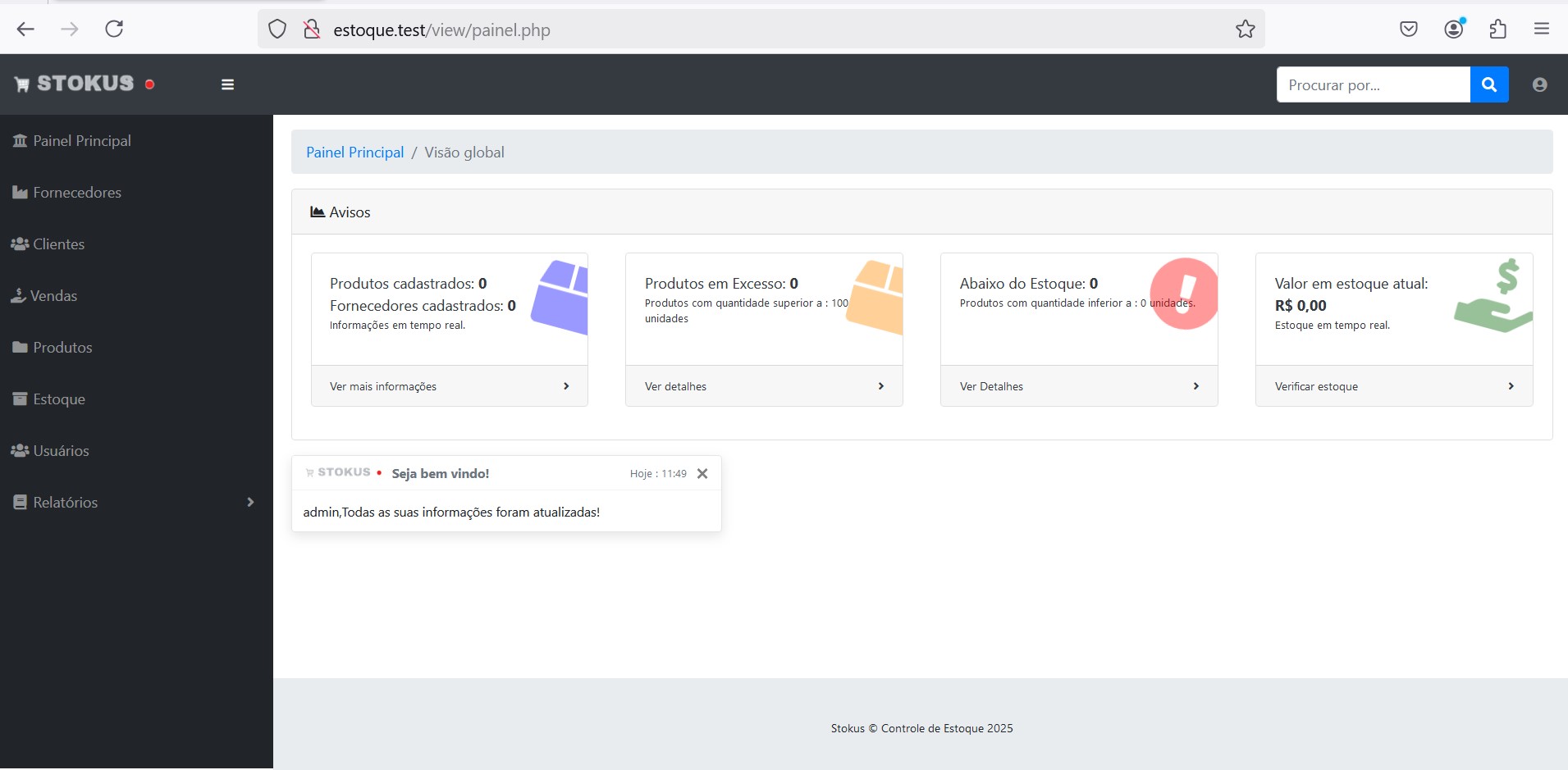 Dashboard (Resumo de vendas, clientes, fornecedores e produtos).