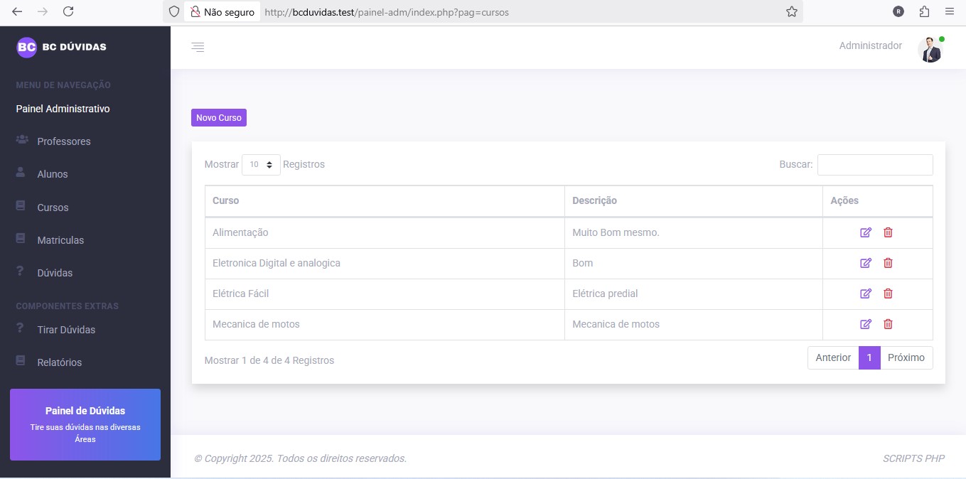 O sistema de Helpdesk de Dúvidas para Cursos é uma plataforma online destinada a facilitar a interação entre alunos, professores e gestores de cursos, proporcionando um ambiente organizado para o registro e resolução de dúvidas sobre conteúdos acadêmicos. A principal função do sistema é centralizar e estruturar as perguntas e respostas, otimizando a comunicação e o aprendizado dentro das instituições educacionais.